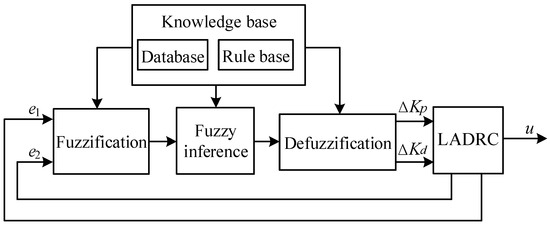 As shown in Figure 7, the observation errors e1 and e2 are taken as the inputs of the fuzzy controller, and the output quantities are two, ΔKp and ΔKd, which represent the increments of the controlled quantities Kp and Kd, so the new gain of the LSEF in the AFLADRC is defined as Equation (5).
