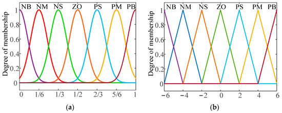 The argument domains of the inputs e1 and e2 and the outputs ΔKp and ΔKd are described by seven linguistic values, respectively. The normalized domain of the input parameters is [0, 1] and the quantized domain of the output parameters is [−6,6]. The fuzzy sets are defined as {NB, NM, NS, ZO, PS, PM, PB}, where each element corresponds to negative large, negative medium, negative small, zero, positive small, positive medium, and positive large, respectively. According to [27], when the slope of the membership function is large, it is very sensitive to the input signal and has a fast convergence speed, but an overshoot phenomenon may occur. When the slope of the membership function is small, the convergence rate will be slow, but the control system is more stable. For macro- and micro-motion systems, the Gaussian function is selected as the membership function of the input variable set, and the triangular function is selected as the membership function of the output variable set, as shown in Figure 8.