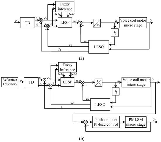 Control structure block diagram. (a) Control block diagram of the micro stage; (b) control block diagram of macro–micro system.