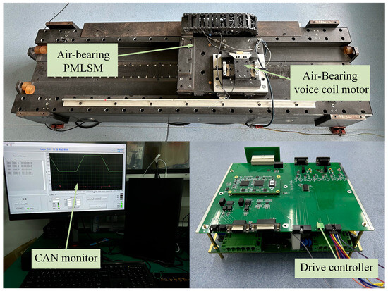 To verify the effectiveness of the proposed method, we constructed a macro–micro linear motion platform as shown in Figure 11, where both the PMLSM and the voice coil motor are supported by aerodynamic guides so that friction can be ignored. The PMLSM is driven by a digital servo control system consisting of an inverter and a control unit, and the voice coil motor is driven by a linear power amplifier and a digital servo control system. The inverter consists of three sets of IGBTs, and the control unit is implemented using the TMS320F28379D and the Pango Spartan-6 FPGA. The TMS320F28379D has dual-core CPUs, each with a frequency of 200 Mhz, with strong floating-point computing power. The Pango Spartan-6 FPGA has a rich set of friction-control features, and the TMS320F28379D has a powerful friction-control system. Using an 18-bit high-precision ADC chip for sampling, the resolutions of the incremental encoder for PMLSM and voice coil motor linearity are 0.1 and 0.01 microns, respectively.