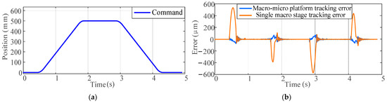 For the motion parameters of 50 cm stroke, 0.4 m/s maximum velocity, and 2 m/s2 maximum acceleration, the tracking error of the platform is about 60 µm, and the positioning accuracy reaches within 1 µm, which can still ensure that the platform realizes high-precision positioning. In addition, under the same stroke and maximum acceleration, the stabilization time of the macro–micro platform increases with the increase of the maximum velocity.