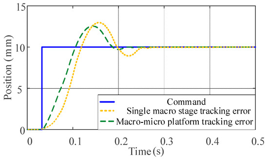 To verify the validity of the macro–micro combination, the micro-stage is locked by means of a rigid connection so that a single PMLSM macro-motion stage can be obtained. Given the S-curve round-trip motion trajectory, the positioning accuracy of the platform in the macro–micro composite mode is compared with that in the single-stage drive mode. The positioning error comparison curves are shown in Figure 12. Given a step signal of amplitude 10 as a reference input at the system position loop, the step response curve of the platform is shown in Figure 13.