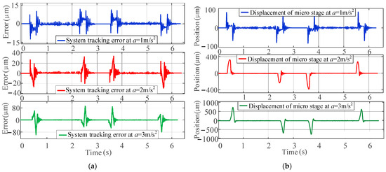 Experimental curves of the macro–micro platform under different accelerations. (a) Macro–micro system tracking error curve; (b) micro stage displacement.