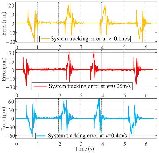 Next, keeping the reference input S-curve trajectory with a travel of 50 cm and a maximum acceleration of 2 m/s2 unchanged, the tracking performance experiments of the macro stage and micro stage were carried out at maximum velocities of 0.1 m/s, 0.25 m/s, and 0.4 m/s, respectively. The experimental results are shown in Figure 15.