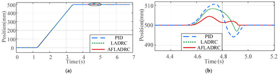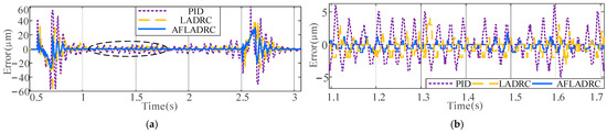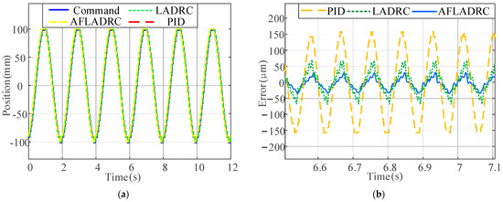 Inputting the macro–micro linear platform frequency of 0.5 Hz and amplitude of a 100 mm sinusoidal signal obtains the platform in different control algorithms under the experimental results shown in Figure 16. From Figure 16b, it can be seen that AFLADRC has a smaller tracking error compared with PID and LADRC, and its maximum tracking error amplitude is reduced by about 83.3%, because LADRC compensates for the acceleration change information caused by disturbances, and, at the same time, the parameters of the LESF controller are adjusted in real time through fuzzy inference to reduce the disturbances. It can be shown that the AFLADRC controller has better performance.