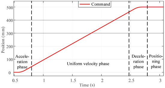 The S-curve trajectory plan with a travel distance of 50 cm, a velocity of 0.25 m/s, and an acceleration of 2 m/s2 is used as a reference input to the platform, as shown in Figure 17. The PMLSM is controlled by position loop PI-lead control and the voice coil motor is controlled by PID control, LADRC, and AFLADRC algorithms, respectively. Figure 18 shows the dynamic tracking error and steady-state positioning accuracy of the macro–micro platform under different methods. It can be seen that the LADRC is significantly better than the PID control, and the tracking error amplitude is reduced by about 20% because the LADRC compensates for the perturbations suffered by the platform during operation with observations. When the adaptive fuzzy control algorithm is added, the AFLADRC adjusts the controller parameters in real time according to the actual running error of the motor, the control performance is further enhanced, and the tracking error amplitude is reduced by about 38.6%. Therefore, the master–slave structure macro–micro control system adopting AFLADRC has higher tracking accuracy and stronger robustness.