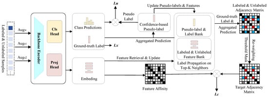where Y represents the initial state , is a parameter ranging from 0 to 1 that assigns weight to the initial labels and aggregated labels, while represents the iterations of label propagation, and multiple iterations of label propagation tend to converge. Finally, the aggregated prediction of the unlabeled sample can be directly obtained from the first row vector of (i.e., ), and then used for confidence-based pseudo-label . Finally, the cross-entropy between the pseudo-label and the strong augmentation prediction is minimized to improve the model performance, as shown in Equation (10).