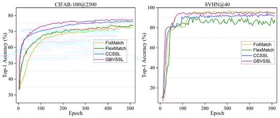 Figure 3 illustrates the fluctuation in GBVSSL’s Top-1 accuracy on the CIFAR-100 and SVHN datasets throughout the training process, and compared to that of FixMatch, FlexMatch, and CCSSL. In comparison to FixMatch and FlexMatch, we observe that CCSSL and GBVSSL converge to higher performance levels at significantly faster rates. Compared to CCSSL, GBVSSL further accelerates the convergence speed. Additionally, GBVSSL outperforms CCSSL on CIFAR-100 with 2500 labels, while it performs comparably to FixMatch on SVHN with 40 labels. This is mainly attributed to the enhanced accuracy and robustness of pseudo-labels achieved through the utilization of aggregated predictions. Higher-quality pseudo-labels can effectively guide the model’s training process and improve the learning quality, thereby resulting in faster convergence speed and superior performance.