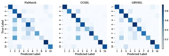 The rows and columns of the confusion matrix represent the true and predicted labels, respectively, illustrating the model’s classification of the samples. As shown in Figure 5, we compare the confusion matrices of FixMatch, CCSSL, and GBVSSL on the STL-10 dataset with 40 labels. Among them, FixMatch overfits to minority classes and fails to recognize the 4th, 6th, and 8th classes. Compared to FixMatch, both CCSSL and GBVSSL effectively reduce confusion among similar classes and correctly identify the 4th class. GBVSSL performs comparably to CCSSL overall, with only a slight improvement in the recognition accuracy of the 6th class. The experiment intuitively demonstrates that GBVSSL possesses strong class discrimination capabilities, thereby enhancing the accuracy of pseudo-labels and improving classification performance.