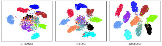 The label-enhanced contrastive module is essentially a graph contrastive module based on an adjacency matrix. It facilitates the model learn discriminative feature distributions, where the features of samples within the same class are encouraged to be as close as possible, while the features of samples from different classes are encouraged to be as far apart as possible. To validate this claim, we present t-SNE visualizations of the features extracted by GBVSSL on the STL-10 dataset with 40 labels, and compare them with FixMatch and CCSSL, as shown in Figure 6. Certainly, the intra-class features of GBVSSL are tightly clustered together, while the inter-class boundaries are clearer and easier to separate. Compared to FixMatch and CCSSL, GBVSSL achieves a superior clustering distribution, thereby yielding more precise predictions and pseudo-labels, consequently enhancing the model’s generalization performance. Furthermore, the strong cohesion of features within each cluster in GBVSSL suggests reduced bias and intra-class variance in classification predictions, thus validating to some extent the correctness and effectiveness of the bias and variance minimization scheme proposed in this study.