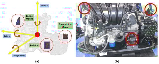 (a) Vibrations from the powertrain; (b) mount structure (red solid circles indicate engine mount, roll-rod, and transmission mount, from the left).