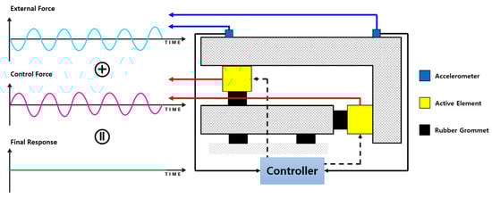 A powertrain mounting system for automotive vehicles is a component that holds up the engine and transmission of a car and restricts their vibration from transferring to the chassis of the car. Rubber is typically used because it is viscoelastic, but it is only effective as insulation within the range of relatively low frequencies and cannot prevent vibration within the range of relatively high frequencies. Automotive fields have recently invested heavily in commercializing electric cars, and considerable research is being conducted to deal with the unexpected force caused by motors and gearboxes, which is more complicated than that generated by the internal combustion engines that are now in use. Yu et al. [] reported the fundamentals and constraints of three difference mount types (passive, active, and half active). Elastic and manual hydraulic mountings are examples of representative passive mounts. These mounts can control vibration within the range of relatively low frequencies, but have limits regarding their inability to do so in the high-frequency region. Electrorheological (ER) and magnetorheological (MR) fluid mounts are commonly used in half-active mounts. These mounts exhibit a superior vibration control ability within the range of low frequencies distinguished with passive ones, yet they are still unable to control vibration within the range of high frequencies. Examples of typical active mounting systems consist of active hydraulic and elastic mountings, which integrate an actuator with an original rubber (passive) mount. The control of vibrations in both high- and low-frequency ranges may be achieved by adjusting the dynamic stiffness of the actuator specific to each frequency band.