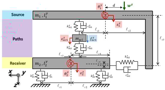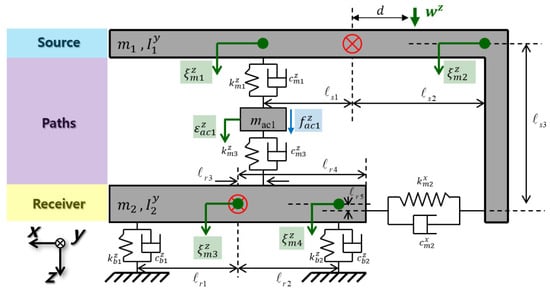 The symbols in Figure 3 used to denote different components of the system are as follows: and are the mass of the source and receiver, respectively; is the actuator mass in the vertical direction; is the moment of inertia of the source in the direction; and is the receiver’s moment of inertia in the direction. denotes the distance from the source’s center of gravity to the point where the exciting force is applied, while and are the span between paths and the receiver’s center of gravity and the source, individually. The Kelvin–Voigt expression was applied to the complex stiffness values, resulting in the following expressions for damping and real stiffness: , , and , , and . The translational and vertical motions of the vertically connected active mounting system, the y-axis rotating motion, and the translational and vertical motions of both the receiver and the source were all accounted for using a five-degrees-of-freedom (DOF) model. The displacement vector, , describes the source’s vertical displacement; is the angle of rotation; is the receiver’s vertical displacement; and is the angle of rotation. is the displacement in the vertical direction for the vertical active mounting system. The variables and represent “excitation force” and “control force,” respectively, because they relate to the vertical active mount. The following equation expresses the constitutive equations that result from deriving the model described above employing the second law of motion by Newton: