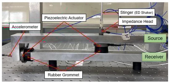 Before commencing the experiment to showcase the model and verify the aforementioned formulae, a numerical simulation was executed to ascertain the model’s achievement utilizing a laboratory configuration, including a framework equipped with two mounts. Table 1 lists the constituent parameters of the simulation. The subsequent experimental apparatus in Figure 7 will be used to validate the simulation results experimentally, upon which these values are predicated. The top section indicates the car’s powertrain, while the bottom section indicates the chassis of the vehicle. Every operational pathway comprises a piezo stack-type actuator and a rubber mount. The signal from accelerometers was recorded instantaneously using a rapid control prototyping system (dSPACE 1104). An input disturbance was engaged utilizing a shaker, and its measurement was obtained using the force sensor (impedance head) connected to the stinger tip. The inertia and masses were computed and measured. The damping coefficient and stiffness were measured using multiple experiments. A pulse voltage signal was used to stimulate the stack mass, while an accelerometer was used to quantify the resulting response. Consequently, a solitary peak indicating the resonance was observed, which was the foundation for estimating the rigidity value via the half-power method and the formulation for the natural frequency.