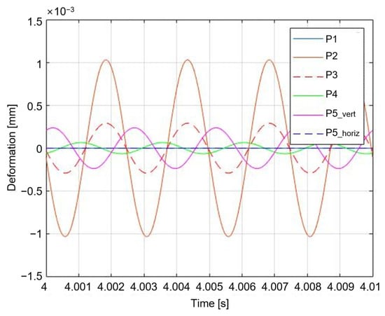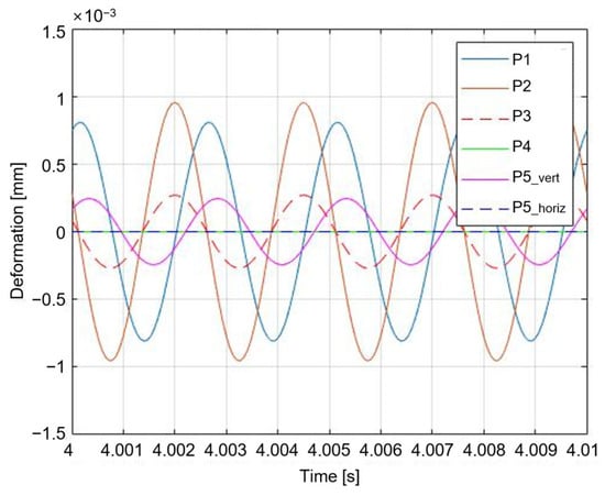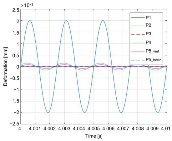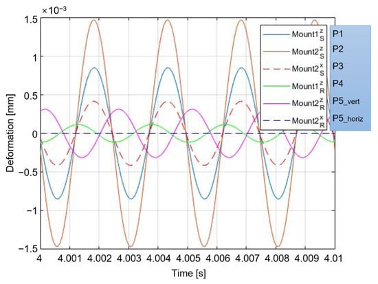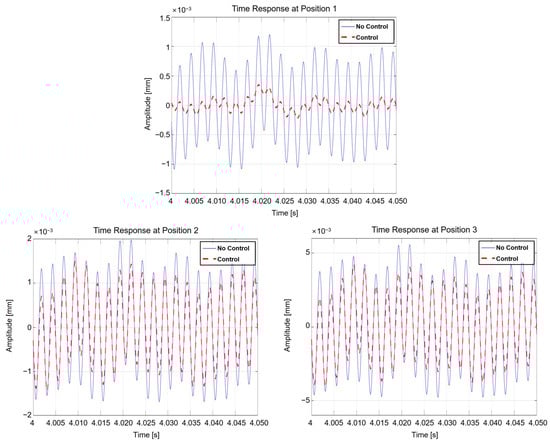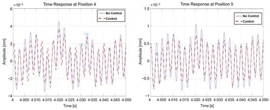 Position 1 in Figure 9 is (marked as P1) in Figure 3 and Figure 4; Position 2 is (marked as P2); Position 3 is (marked as P3); Position 4 is (marked as P4); and Position 5 is (marked as P5_vert) and (marked as P5_horiz) in Figure 4. In Case 1, the vertical displacement of zero is specified at position 1. In Case 2, zero displacement in the vertical direction is specified at position 4. In Case 3, the vertical displacement of zero is specified at position 2. In Case 4, zero displacement in the vertical direction is specified at position 5. The input of the vertical active mount in the subordinate route, which aims for zero displacement in the vertical direction, was substituted to run the simulation. Table 2 lists the root mean square values without and with controls, and Figure 10 shows the response plot in the steady state for Case 1, which focuses on the displacement of the source in the vertical direction next to the vertical mount to be ‘0’.