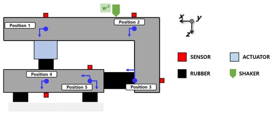 The response may be expressed by using the input disturbance, control force, and the compliance matrix, as expressed in Equation (23). This suggests that the movement of each position can be expressed using the amplitude of the input disturbance, the amplitude of the control force, and the phase. Equation (24) expresses the displacement of each location: