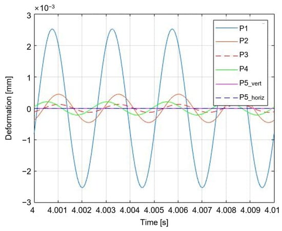The excitation frequency, excitation amplitude, and sampling frequency were set to 400 Hz, a sinusoidal signal of 10 N, and 15 kHz, respectively, to simulate the calculated secondary path input of the five-DOF model. Figure 8 expresses each displacement response in the case that the input force is only applied to the system model.