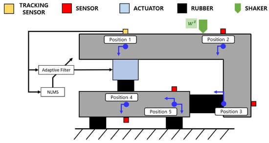 When using the estimated input of the subordinate path for controlling, the control input needs to be calculated again each time there is a change in the surrounding environment or the stimulation force. It should be handled by an adaptive digital filter that regulates the filter coefficients in response to environmental factors to address this problem. Vibrations can be managed using representative adaptive filter techniques, like the algorithm called least mean squares (LMS). The LMS algorithm is often used for vibration and noise reduction because it is a straightforward and reliable technique. Also, the algorithm is easy to implement and shows relatively good performance for active vibration control (signal tracking problems). The disadvantage is that the convergence rate is somewhat sluggish, and the initial values heavily affect the convergence characteristics’ filter coefficients. The normalized LMS (NLMS) technique, which focuses on the shortcomings of the original LMS, and the vibration control approach in real time by closely observing the response of the source—a signal with the highest level from all the responses—were used in this study. A computer simulation assessed the suitability of the procedure before it was tested experimentally. Figure 14 presents a diagrammatic version of the five-DOF NLMS control simulation.