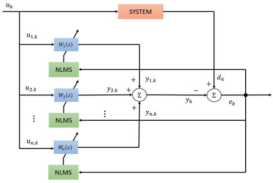 The frequency component of Equation (38) was inserted for each NLMS input, as expressed in Equations (39)–(41).