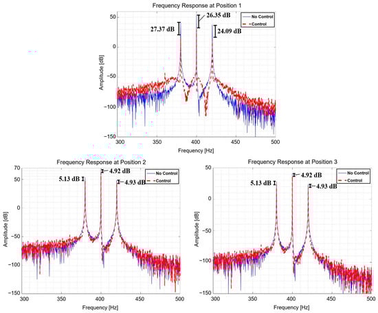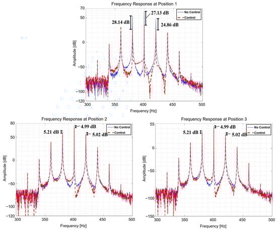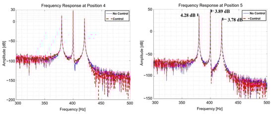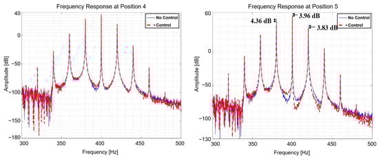 Equation (42) is used to provide the frequency components for each NLMS input, as seen in Equations (39)–(41). Figure 20 and Figure 21 depict the outcomes of the multi-NLMS control when the excitation force is a frequency modulation (FM) signal. In addition, for each position, the RMS response from four to 4.05 s in the time domain was compared with Table 10 before and after control, and the RMS response from 300 Hz to 500 Hz in the frequency domain was compared with Table 11 to understand the reduction performance.
