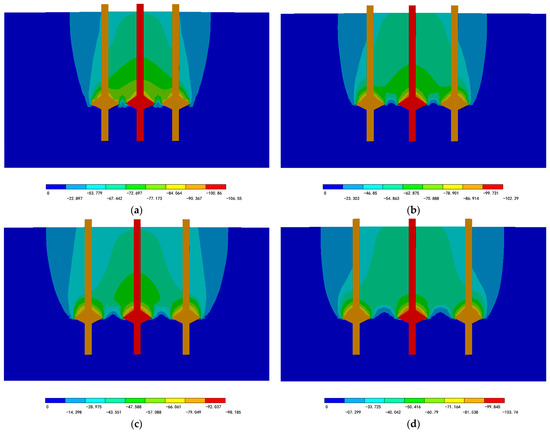 The Z-direction displacement contour maps, delineating the failure state of the soil, were meticulously extracted and analyzed. Specifically, the displacement contour maps for soil sections around piles 1 and 2 in the four-pile group, piles 1, 2, and 3 in the six-pile group, and piles 4, 5, and 6 in the nine-pile group were obtained. For enhanced analytical clarity, these contour maps were extended along the symmetrical planes to display a complete view of the entire pile group model. These maps are depicted in Figure 8, Figure 9 and Figure 10.