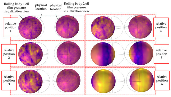 After the simulation, the Comsol software tracked the movement of two adjacent rolling bodies from contact to separation and recorded the real-time distribution and change of oil film pressure. The color change from purple to yellow shows that the oil film pressure gradually decreases; that is, purple means there is more oil in the film, and yellow means there is less oil in the film. This is shown in Figure 1.