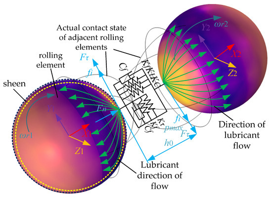 The oil film flow of adjacent rolling bodies and Equation (15) show that when two adjacent rolling bodies hit each other quickly, if you do not take into account the rotation of the lubricant, the rolling bodies will have spherical flow on both sides, even though the rolling bodies are actually rotating. Because of inertia, when two rolling bodies collide, the lubricant builds up on one side, making it thicker than the other. This happens when the two bodies bump into each other in the direction of spin along the normal direction. But, it is not enough to just look at the normal direction to tell if the oil film rupture causes the adjacent rolling body contact form to change again. You also need to look at the tangential contact modeling study of the adjacent rolling body collision. Figure 2 shows that when two rolling bodies next to each other hit each other, the moving rolling bodies cause the lube oil film to move in a tangential direction. This lets us figure out the lube oil film shear force model: