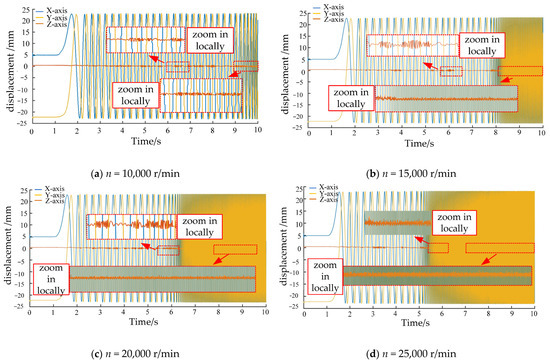 It is clear from Figure 4 that the rolling body will move in three different ways after the rotor falls and turns the inner ring of the bearing. These are the unsteady zone, the smooth zone, and the surge zone. The Z-direction (axial) angular displacement change of an unstable-zone rolling body is clear; the value goes up and then down. The X-direction and Y-direction (radial) angular displacement changes are smoother, though there are times when the rate changes from slow to fast. When the rolling body first starts to move, its rotation and rotational speed are slow because of the contact angle and the axial rotation tendency of the joint. But, as the speed goes up, the rotation and rotational movement gradually take over the rolling body movement. On a smooth surface, the rolling body’s angular momentum change is more stable in all three directions. However, there is a local value of the surge that happens because the rotor slips in the inner circle, which is caused by the rolling body’s unstable rotation. As the speed of the inner ring and rotor tends to stabilize, the rolling body’s angular displacement moves into the surge area. The axial angular displacement value surge is clear, and the radial angular displacement for speed change frequency surge is clear. This shows that the centrifugal force is controlling the rolling body’s movement at this point, causing the rolling body to move to the middle of the bearing and the contact angle of the bearing to become smaller. From Figure 4a–d, we can see that as the rotor’s falling speed goes up, the rolling body’s angular movement in the unstable zone does not last as long. Because the smooth zone does not last as long, it enters the surge zone more quickly. But, when the rolling element’s angular displacement in the axial direction enters the surge zone, the surge value goes up a lot. This means that the value of the bearing contact angle goes down a lot, which makes the operation of the bearing a lot less certain.
