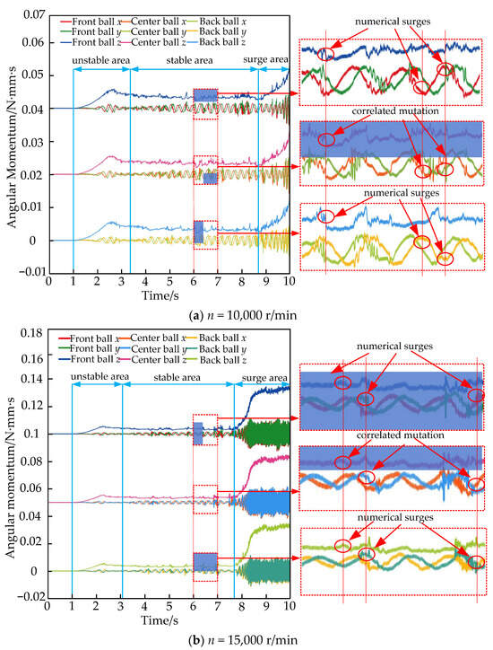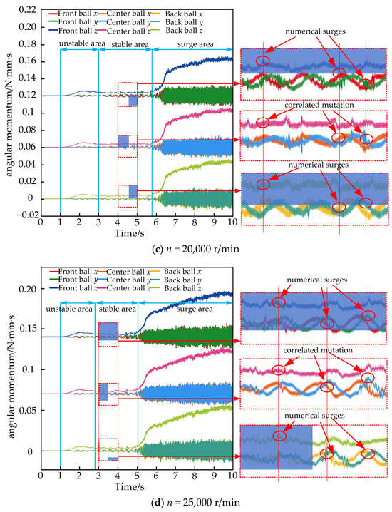 If the rotor falls and hits the inner ring, it moves with the rotation, and the rolling body moves with the rotation along with the inner ring. As we look more closely at Figure 3, we can see that the rolling body moves along the X-axis and Y-axis, following the law of periodic interval change. However, the curve at the farthest point in the negative direction of the Y-axis is not smooth, and there is an area with curving. This is because the bearing area has the lowest set of useful slots. This causes the rolling body’s rotational speed to first rise and then fall, which changes the rate of displacement. The movement change is slower at first and then faster when the rolling body passes the farthest point in the positive direction of the Y-axis. This is because the farthest point in the positive direction of the Y-axis is in the part of the bearing that is not carrying anything. As soon as the rolling part gets close to the highest point, gravity stops it from turning. Gravity will speed up its movement after the highest point, which will cause small but quick changes in the moving body’s position. The most obvious change in the z-axis displacement rate is when the rolling body goes through the functional slot. In the bearing contact angle, gravity and the structure of the functional slot work together to cause the z-direction displacement to happen at a very low value but a higher frequency. The rate of change in movement is much faster when the motion of the dropped rotor on the inner ring is stable. Looking at Figure 3a–d, we can see that as the falling rotor speed goes up, the time it takes for either rolling body to reach the stability stage in the X- and Y-axes directions goes down. Because the rate of change in displacement is less important, as the rolling body moves through the highest point of the functional slot and the non-bearing area, the faster the rotor drop speed. Instead, as the rotor drop speed goes up, the rate of change of the rolling element’s displacement in the Z-axis direction goes up. Shown in Figure 3 is the rolling body’s overall motion trend. To gain a better idea of how it affects other rolling bodies when it rotates, this section is further focused on solving the angular momentum changes along the X-axis, Y-axis, and Z-axis. This gives us three sets of angular momentum comparison plots for the rolling body, which are shown in Figure 4.