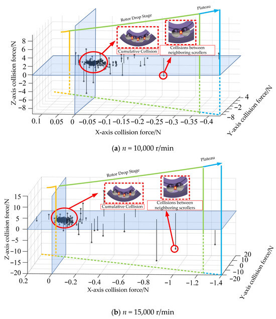 This part uses the fourth-order and fifth-order Lunger–Kutta integration method with variable step size to figure out the rolling body’s displacement and angular momentum while taking into account the flow of the oil film and collisions that do not happen smoothly in a straight line. It also looks at how the rolling body’s overall collision shape changes after the local function slot is set up. After setting the rotor’s dropping speed to 10,000 r/min, 15,000 r/min, 20,000 r/min, and 25,000 r/min, centrifugal force will take over and make the rolling element less stable [32]. As a result, no working condition with a speed greater than 25,000 r/min was chosen. The load was set as a joint load, with 2000 N of radial load and 200 N of axial load. The rolling body’s motion was solved in three directions, as shown in Figure 3.