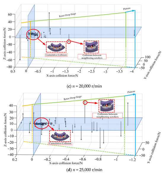 From Figure 5a–d, we can see that the maximum axial collision force rises as the speed of the rotor falls from 10,000 r/min to 25,000 r/min. However, the general collision form law of the rolling bodies next to each other stays the same. But, compared to the axial collision force at a falling speed of 20,000 rpm, the maximum value at 25,000 rpm is not very strong, and there are more collisions between rolling things that are close to each other. Adding the angular displacement analysis to the picture shows that this is because the bearing contact angle is getting smaller and closer and closer to the critical value that is caused by the bearing working in a way that causes irregular vibrations, which leads to a big rise. We need to look into the fractal motion of rolling bodies and the chaotic features of their impact in order to answer the question of whether there is a non-smooth connection between the non-smooth collision of rolling bodies and the uneven vibration of bearings.