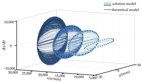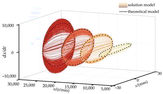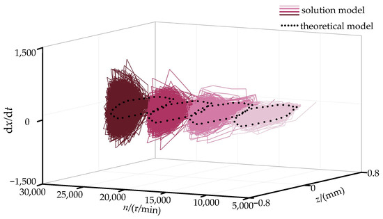 It is known that when rolling bodies collide, the motion becomes chaotic. In this section, we compare and analyze the phase diagrams of the system in the X-, Y-, and Z-directions at different speeds with a theoretical model of rolling body motion in its ideal state to look into the chaotic features that occur when two rolling bodies collide next to each other. Before obtaining the fractal comparison diagram of rolling body motion, the displacement and velocity data of bearing rolling bodies are solved directionally at four falling speeds of 10,000 r/min, 15,000 r/min, 20,000 r/min, and 25,000 r/min. The falling speed, displacement, and velocity data are then fitted into the system phase diagram using Matlab 2021b software. In Figure 6, you can see a comparison picture of the rolling body’s motion in the X-direction.