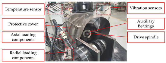 In this part, we set the following requirements for the testing conditions of bearing irregular vibration. It can go from 1800 r/min to 8000 r/min, and the radial load Fr can be anywhere from 500 N to 2000 N. The axial load Fa can be anywhere from 300 N to 500 N. In order to measure the vibration signs of the local functional-slot cage-less ball bearing, the T10-60 model bearing experimental machine (Luoyang Research Institute, Luoyang, China)is chosen, as seen in Figure 10. There is a flexible connection between the main shaft of the T10-60 experimental machine and the high-speed electric spindle. The high-speed electric spindle can go as fast as 24,000 r/min. There is a flexible connection between the main shaft of the T10-60 experimental machine and the high-speed electric spindle. The high-speed electric spindle can go as fast as 24,000 r/min. There are three sets of bearings on the main shaft: the experimental bearings for uneven vibration and four deep-slot ball bearings. The experimental bearings are installed in the top set of bearings, and the deep-slot ball bearings are installed in the other two sets. To measure the radial load of the T10-60 experimental machine, the load is put on the bearing bush in the middle position and then sent to the experimental uneven vibration bearing. This is performed using the two deep-slot ball bearings.