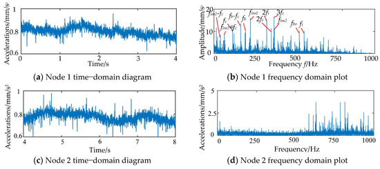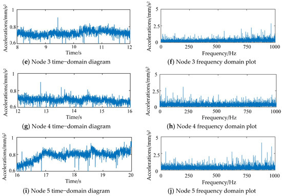 You can see from Figure 11 that the local function-slot without-cage ball bearing’s uneven vibration time–domain signal in node 1 shows an acceleration from high to low trend. Nodes 2 through 4 show a smoother acceleration trend, and node 5 shows a rapid acceleration trend. The above trend matches the inner ring and rolling body motion attitude in the trend, which shows that the theoretical analysis is correct. At the same time, it is discovered that the acceleration surge phenomenon is stronger in the stage from node 2 to node 4, which means that there are more collisions between rolling bodies in this stage.