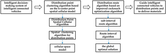 Based on the research background of distribution routes logistics, and analyzing the existing problems in logistics route research, we construct an intelligent connected vehicle material distribution route model based on spatial cellular clustering and the improved cockroach optimization algorithm. Firstly, by integrating intelligent connected vehicle technology, a decision system for the intelligent connected vehicles used for the logistics distribution is constructed, which includes the “distribution point clustering algorithm based on k-center spatial cellular model” (Module 1) and the “distribution route algorithm based on the improved cockroach optimization algorithm” (Module 2). Module 2 includes two sub-modules: a “station sub-interval route algorithm based on the cockroach optimization algorithm” and a “distribution route algorithm based on the cockroach optimization algorithm”. The goal of Module 1 is to construct a spatial relationship between the distribution centers and the distribution points, then cluster the distribution stations based on the spatial accessibility model, and achieve the optimal spatial allocation of the distribution points in the neighborhoods of the distribution centers. The goal of Module 2 is to construct the optimal route between the distribution centers and the distribution points, in which the station sub-interval is the micro-interval for the operation of intelligent distribution vehicles, which has a decisive role in the overall distribution route. The optimal route model within the sub-interval is based on the geospatial constraints within the micro-interval. The overall route of an intelligent distribution vehicle consists of the multiple sub-intervals of the route, and the optimal route model within the whole route is based on the geospatial constraints of the entire city. According to the modeling concept, the overall research architecture is as follows, and the constructed intelligent connected vehicle distribution route model is shown in Figure 2.