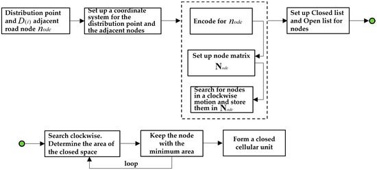 The cellular unit searching azimuth is and the azimuth increasing arc is . Starting from the due north direction of the distribution point , rotate the searching radius clockwise at a uniform angular velocity around the cellular unit. Stop the search when the nearest road node is found. If it is determined that the road node is a cellular unit control point , record the angle between the searching radius and the due-north direction. This angle is defined as the cellular unit searching azimuth , and the uniform angular velocity is defined as the azimuth increasing arc .
