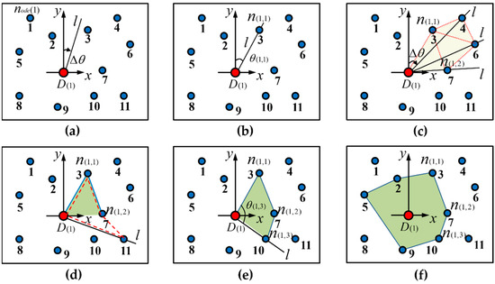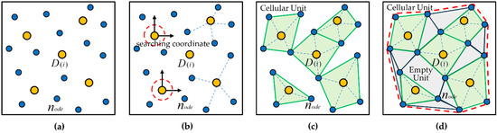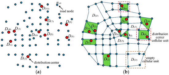 The distribution point spatial cellular unit is and the cellular unit control point is . The distribution points in the urban geographic space have spatial attributes such as longitude and latitude, spatial distance, and an adjacency relationship. The closed convex polygonal space formed by the distribution point and the nearest road nodes in the neighboring micro-space is defined as the distribution point spatial cellular unit , in which the distribution point is the core of the unit. All neighboring nodes that make up a cellular unit are defined as the cellular unit control point , in which represents the unit number and represents the No. control point of the unit. According to the definition, the cellular unit and its control point satisfy the following conditions: