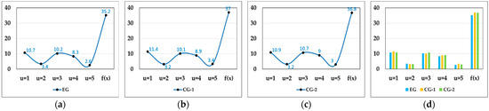 The Dijkstra optimization algorithm and the A* optimization algorithm are set as the control group. We output the sub-interval costs and route costs on the same distribution route for the experimental group and control group, as shown in Table 9. The experimental group is represented as EG, the Dijkstra optimization algorithm for the control group is represented as CG-1, and the A* optimization algorithm for the control group is represented as CG-2. Based on the results in Table 9, we obtain the curves of the sub-interval costs and the total route costs, and comparison charts for the experimental group and the control group on their distribution routes, as shown in Figure 16. Figure 16a shows the sub-interval costs and the total route cost of the experimental group, Figure 16b shows the sub-interval costs and the total route cost of the Dijkstra optimization algorithm, Figure 16c shows the sub-interval costs and the total route cost of the A* optimization algorithm, and Figure 16d is the comparison bar chart between the experimental group and the control group, in which the blue bar represents the experimental group, the yellow bar represents the Dijkstra optimization algorithm, and the green bar represents the A* optimization algorithm.