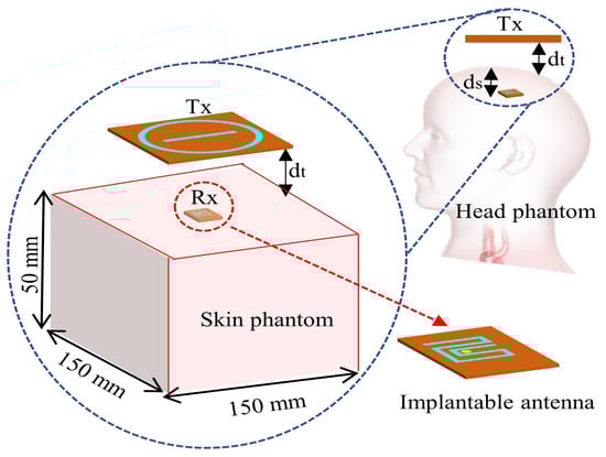 The proposed wireless power transfer (WPT) system underwent design and analysis utilizing the HFSS simulation software. Initially, a homogeneous skin phantom (HSP) measuring 150 × 150 × 50 , was used in the WPT system, as depicted in Figure 1. The implantable receiver was positioned at a depth (ds) of 8 mm within the phantom while maintaining a gap (dt) of 8 mm between the HSP surface and the external Tx element.