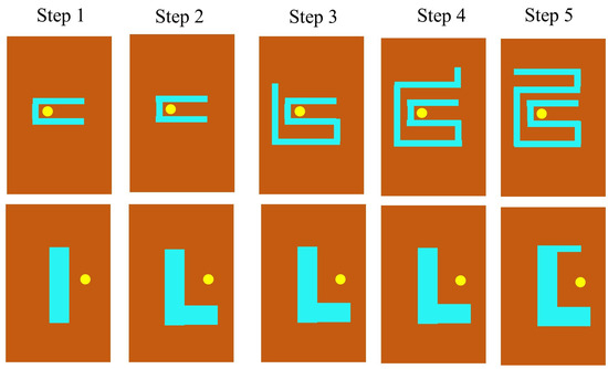 A meandering antenna is the best candidate and prime choice for an implantable antenna for various reasons. This technique offers numerous benefits, including compactness and space efficiency, an extended operative length, improved impedance matching, and reduced electromagnetic interference [28]. The design, optimization, and miniaturization of the proposed antenna are accomplished through several steps, outlined as steps 1–5 and illustrated in Figure 3. One of the techniques employed involves introducing several slotted meander lines in the radiator to elongate the current path. This method is widely recognized as an effective approach for miniaturizing implantable antennas [29].