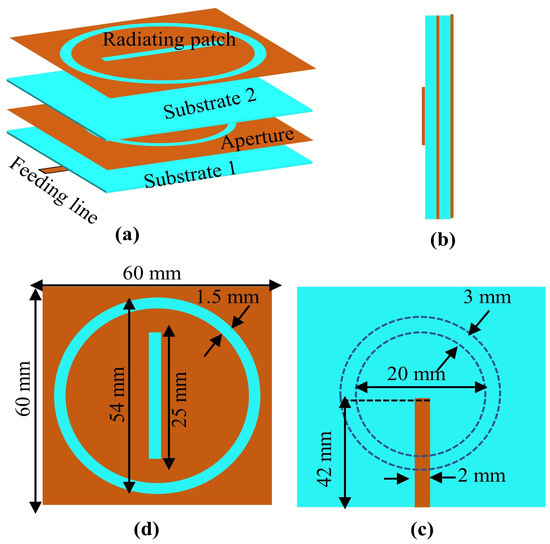 Detailed structure of the transmitting antenna (unit: mm). (a) Isometric view. (b) Side view. (c) Dimensions of the aperture and feedline. (d) Front view.
