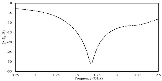 One fundamental aspect to understand about dielectric properties (, ) is their dependence on the frequency of the electromagnetic waves interacting with the material. As the frequency changes, the response of the material to the electric field also changes [32]. This frequency dependence is often characterized by the material’s frequency response, which describes how its dielectric properties vary across different frequencies. This simulation considers skin tissue’s dielectric properties, accounting for frequency dependence. A dielectric constant of = 41 and = 1.08 S/m at 1.71 GHz are used in this simulation. Subsequently, employing the finite element method (FEM) within HFSS, the scattering parameters were computed. This encompassed the determination of reflection coefficients (S11, S22) along with transmission coefficients (S21).