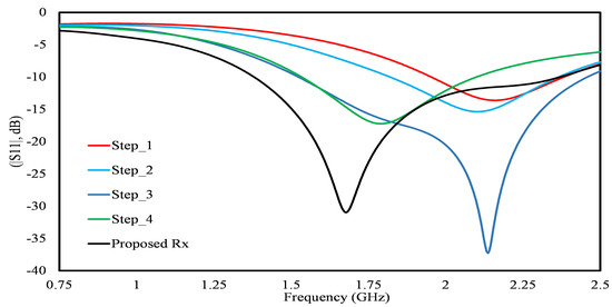 Figure 6 illustrates the reflection coefficient (S11) of the receiver (Rx). The analysis indicates that the proposed implantable antenna achieves a reflection coefficient of −32 dB at the resonant frequency of 1.71 GHz. Furthermore, the antenna exhibits a wide operating range, from 1.38 GHz to 2.37 GHz, ensuring versatility in frequency compatibility. Additionally, Figure 7 explores and presents the impact of the slotted meander line and the ground plane configuration on the parameter, demonstrating progressive changes from step 1 to step 5. In the preliminary simulation configuration, the receiving antenna was kept at a depth of ds = 8 mm.