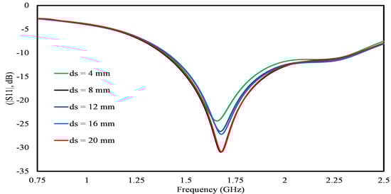Furthermore, real-world scenarios often introduce uncertainties regarding the precise implantation depth due to locational variations. To observe the antenna’s robustness across various implantation depths, its effect was observed with ds varying from 4 to 20 mm, incremented by 4 mm steps. The results demonstrate minimal impact on the antenna’s scattering parameters within the desired frequency range, as depicted in Figure 8, highlighting the impressive stability of the proposed implantable antenna. Moreover, the stable performance across various depths suggests the suitability of the proposed antenna for a wide range of implantable applications.