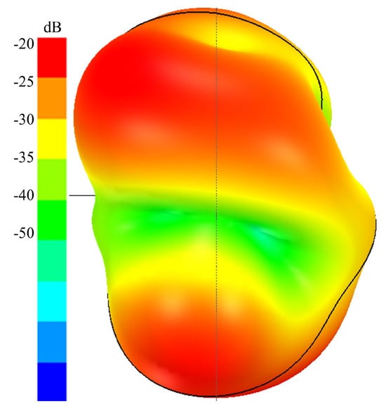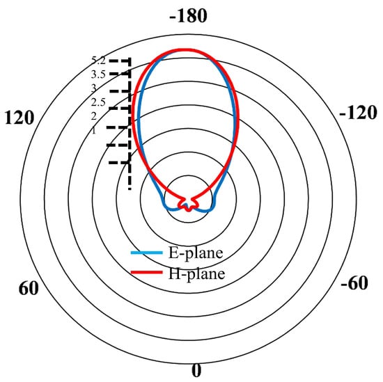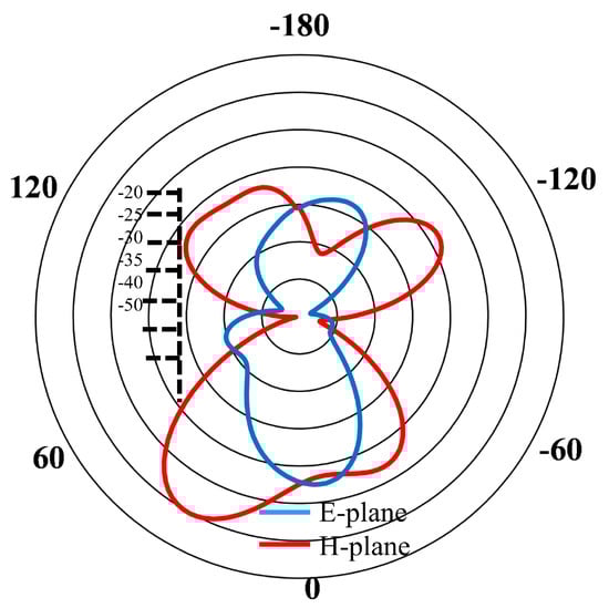 Figure 9 provides a comprehensive view of the antenna radiation characteristics through its 2D radiation pattern, highlighting both the E and H planes. The radiation pattern demonstrates a distinct directional preference, with the antenna exhibiting its highest gain toward the transmitter (Tx). Although some side and back lobes are present due to the truncated ground plane, the focused radiation pattern significantly enhances the antenna’s power-receiving capabilities, ensuring optimal energy transfer efficiency in the targeted direction. Furthermore, Figure 10 provides detailed insight into the antenna’s radiation characteristics through its 3D radiation patterns. These patterns reveal some side and back lobes due to the truncated ground plane, but overall, they highlight the antenna’s suitability for implantable applications. This observation reaffirms the antenna’s directional efficiency, which is crucial for optimizing power transfer and minimizing spurious radiation in biomedical contexts.