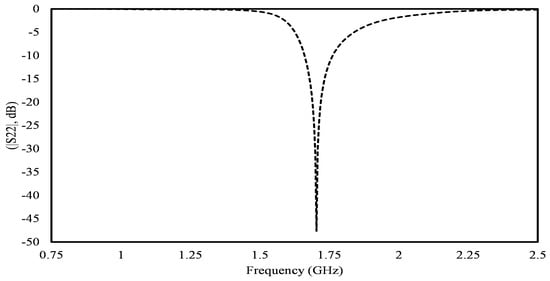 In Figure 11, the reflection coefficient (S22) of the transmitting antenna is depicted. The transmitter resonates at 1.71 GHz, exhibiting a −10 dB bandwidth from 1.66 GHz to 1.765 GHz. This bandwidth ensures efficient transmission within the desired frequency range, contributing to the robust performance of the transmitting antenna.