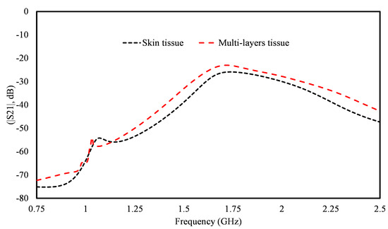 We extended our simulations to include an inhomogeneous medium composed of a model with layers of air, skin, fat, muscle, and heart tissue. The tissue layers and their respective thicknesses were selected to approximate the properties of the human body, specifically 2 mm of skin, 4 mm of fat, 10 mm of muscle, and 15 mm of heart tissue. In our simulations, the transmission coefficient (S21) for the inhomogeneous model was found to be −23 dB, corresponding to a power transfer efficiency (PTE) of approximately 0.501%. In contrast, the homogeneous medium yielded an S21 of −25 dB, which equates to a PTE of 0.316%. Figure 16 presents the transmission coefficients for both scenarios, highlighting the differences between homogeneous and inhomogeneous tissue models.