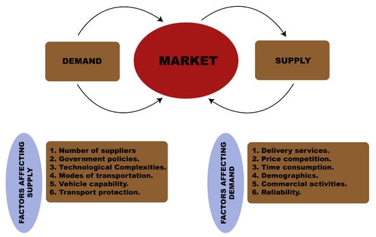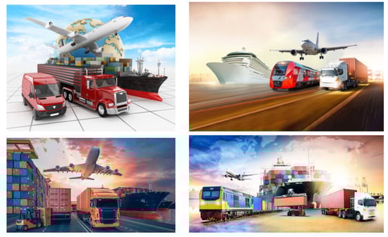 The complexity of today’s logistics requires sophisticated strategic optimization to balance multiple competing objectives. In this manuscript, we explore a comprehensive approach to solving complex navigation problems through the power of multi-objective optimization []. Multi-objective optimization is the simultaneous consideration of several objectives, which are often mutually exclusive, requiring a balance to achieve the best overall result. In navigation, the primary objectives are usually to minimize cost savings, increase reliability, and ensure on-time delivery. Traditional single-objective optimization methods do not adequately consider the trade-offs between these objectives, resulting in suboptimal solutions. By adopting multiple optimization objectives, this study aims to provide a comprehensive and effective framework for increasing transportation productivity. The transportation system refers to the movement of cargo or people between two ports or cities within a national or international network as shown in Figure 1. National and worldwide networks include carriers, matching networks, modes of transportation, network paths, itineraries, cities, depots, clients, stations, and terminals. An itinerary, a type of transportation, connects a number of nodes in the transportation system’s network. Between two nodes, the itinerary represents a single link and mode of transport. We refer to the nodes as exchange stations where we can load and unload goods, transship them, or deliver them. The main problem is the sustainability of the cost of the goods, which is directly proportional to the cost of transportation [,].