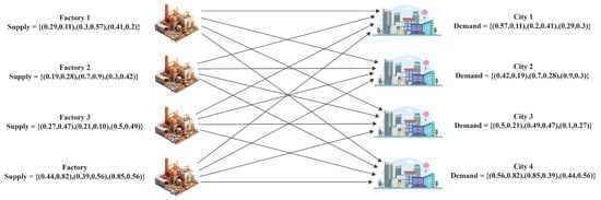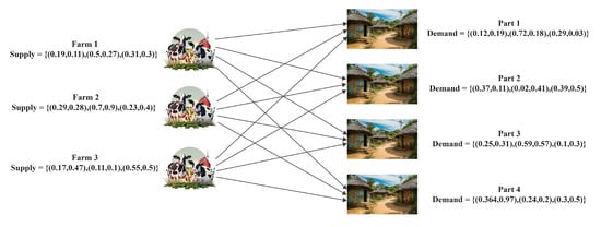 Two different types of costs relate to the problem of fixed-charge transportation: a fixed charge in a route, paid when a non-zero amount of products transfers between the source and the destination, and a variable cost that gradually increases with the number of items transported [,]. The predetermined cost could include a variety of items such as permit fees, toll taxes, subscriptions to festive occasion events, and car rentals. According to these circumstances, the transportation problem (TP) transforms into the generalized form of the fixed charge transportation problem (FCTP). The objective of those responsible for making decisions is to identify the ideal route combination that results in the lowest possible total cost of fixed and variable costs while simultaneously satisfying the supply and demand requirements of each FCTP source and destination. For example, giving a lot of different ways to deal with uncertain answers and rough assessments of fuzzy set data is a good way to solve multi-objective optimization problems [,]. Traditional optimization techniques fail to adequately consider the inherent fuzziness of parameters like cost, supply, demand, etc., in transportation problems, instead modeling them as fuzzy. This micro-representation causes the optimization model to more efficiently and effectively reflect real-world uncertainties, making solutions more effective. In multi-objective optimization, the conflict arises from the inability to meet all objectives with their optimal value simultaneously, a balance that the traditional single-objective optimization method cannot attain. The advantage of fuzzy sets is that they can achieve each of the goals with their own membership function []. For example, we can define fuzzy goals such as cost, dependability, or delivery times. We then apply this to the optimization process, aiming to find the best solution that closely aligns with the membership function of these objectives, all while implementing an efficient trade-off. This way, the possibility of achieving all of them at once is guaranteed, and the final outcome will also be rational and efficient [,].