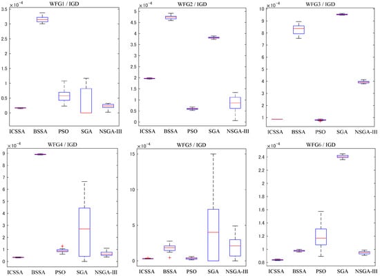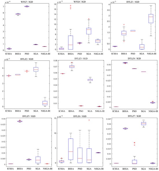 Box plots of IGD distribution for ICSSA, BSSA, PSO, SGA, and NSGA-III algorithms.
